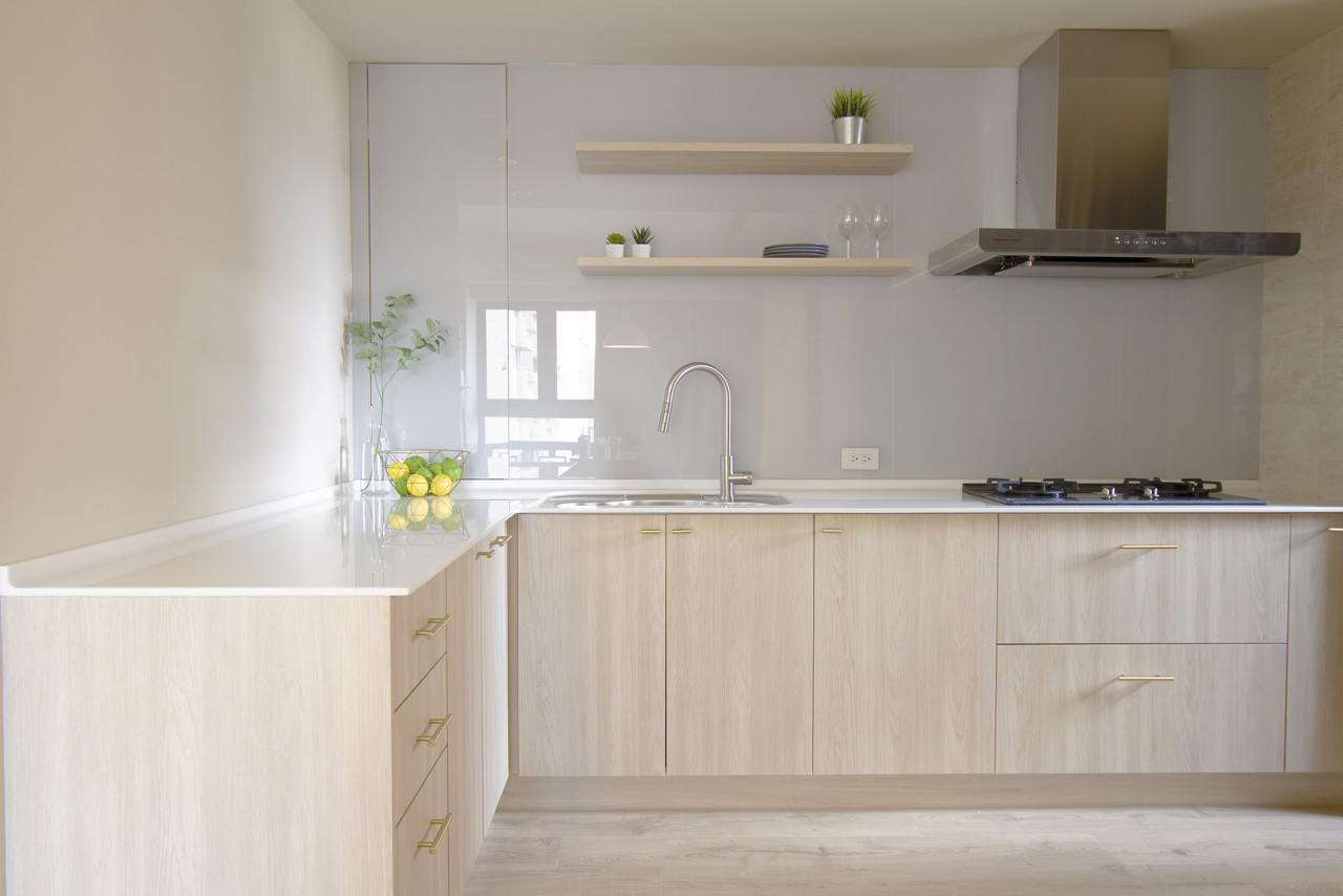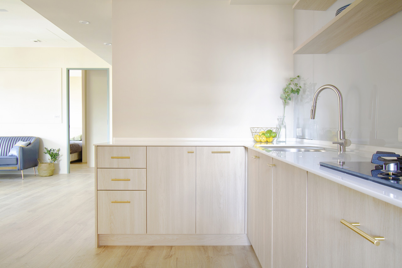 北歐風|和平大苑 北歐風格強調木質元素、白色調與自然光的結合,營造出舒適且自然的室內氛圍,讓生活充滿溫馨與踏實感。 廚房採用淺色木質櫥櫃,搭配金色拉手和白色檯面,並搭配金屬水龍頭和不鏽鋼水槽,增添現代感。 明亮寬敞的設計,使空間感十足,為追求時尚與舒適的家庭提供了理想的生活環境。